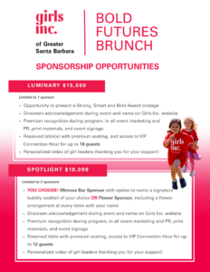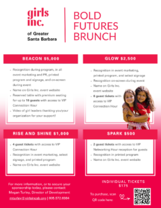 For more than 68 years, Girls Inc. of Greater Santa Barbara has been a champion for girls and young women, equipping them to overcome gender, economic, and social barriers, and preparing them to thrive in every stage of life. The Bold Futures Brunch is more than a fundraiser—it is a celebration of resilience, courage, and the limitless potential of the girls we serve. It is also a joyful gathering of those who believe, as we do, in the power of investing in girls.